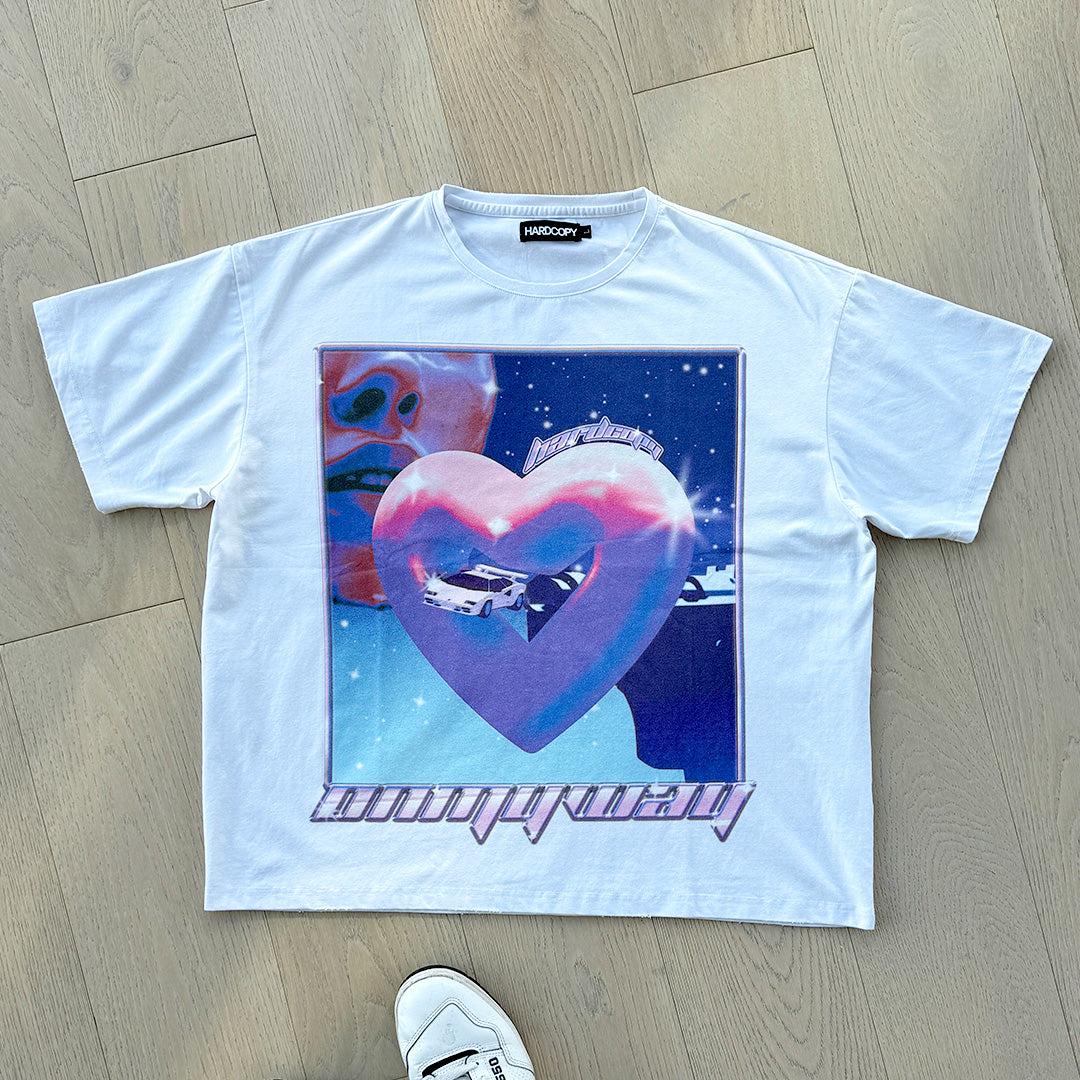 • Print depicts a 1980 lamborghini countach launched out a beretta m9 through an open heart in deep space